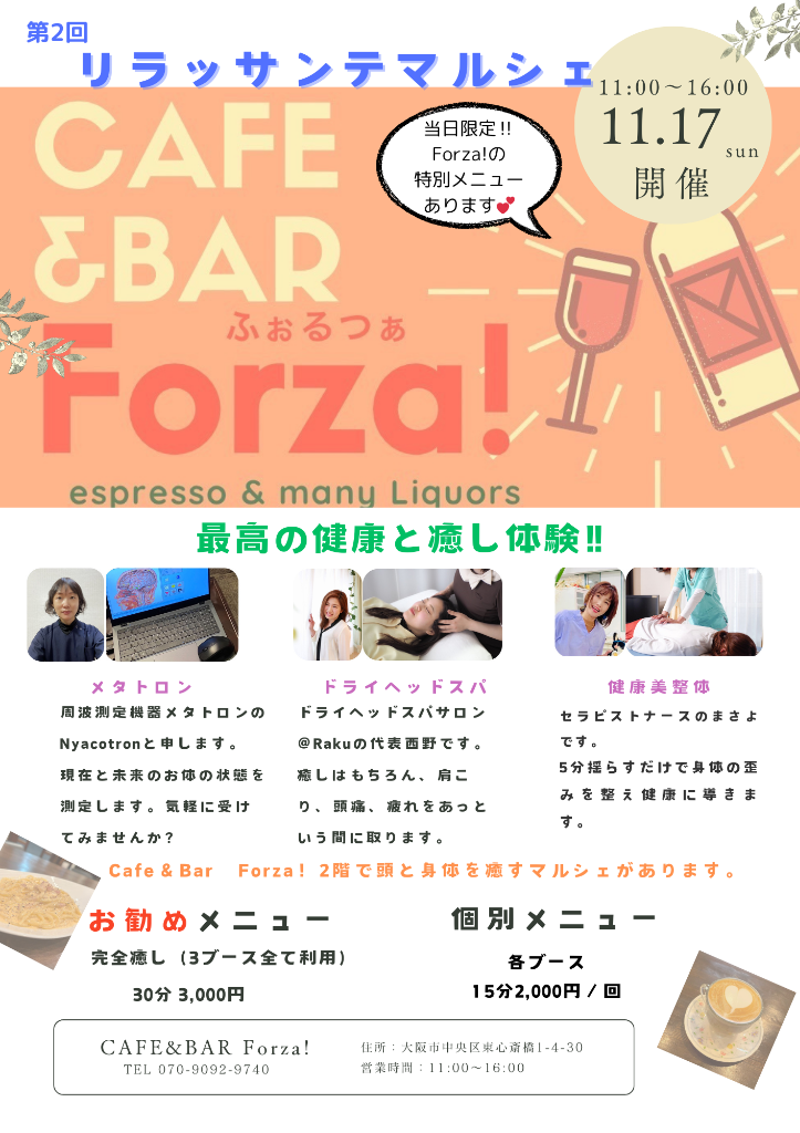 17日は、堺筋線長堀駅7番出口を出て一分のところにあるCafe &Bar Forza!で心と身体を癒すリラッサンテマルシェを開催します。